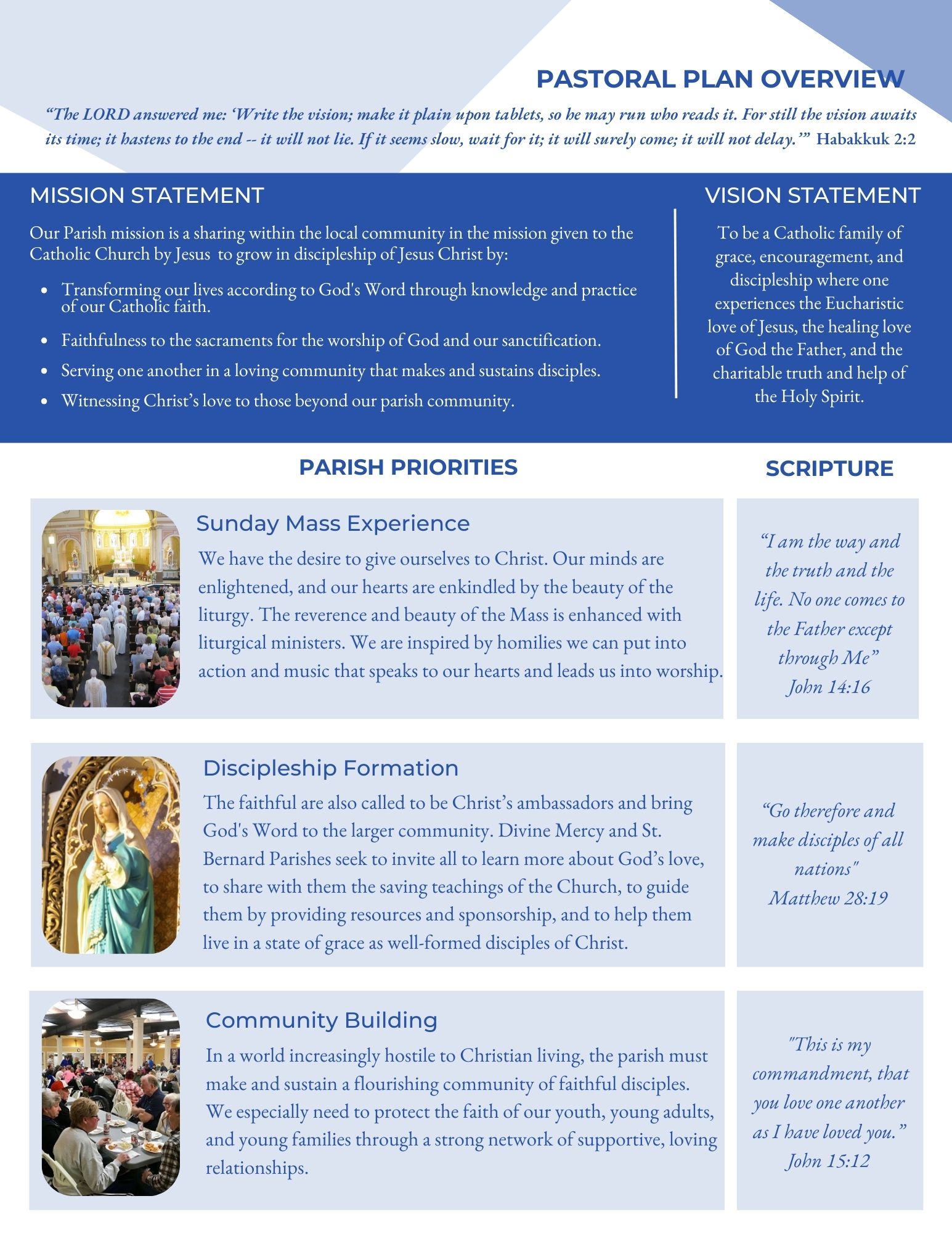 Led by our Catholic Leadership Institute (CLI) consultant, Tricia Cellucci, Fr. Martin chose a team of parishioners from both parishes to articulate our parish mission and envision our parish priorities. Over a period of 4 months, Tricia facilitated six meetings with our envisioning team. We began by evaluating the information gathered from our parish survey, local demographic data, and the parishioner focus groups and interviews with our CLI consultant. The Pastoral Plan you see here is the fruit of this envisioning process.